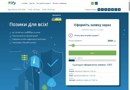 ify.ua - это именно тот сервис, который помогает в трудную минуту. Взял займ в первый раз, и переживал по поводу многократных переплат. Но на сайте ... Aún ify.ua - это именно тот сервис, который помогает в трудную минуту. Взял займ в первый раз, и переживал по поводу многократных переплат. Но на сайте есть множество компаний с низкими процентами. Заполнение заявки было простым и без лишних бумаг. Деньги пришли на счет быстро, и я остался доволен. Теперь я регулярный клиент и всем советую этот сервис!